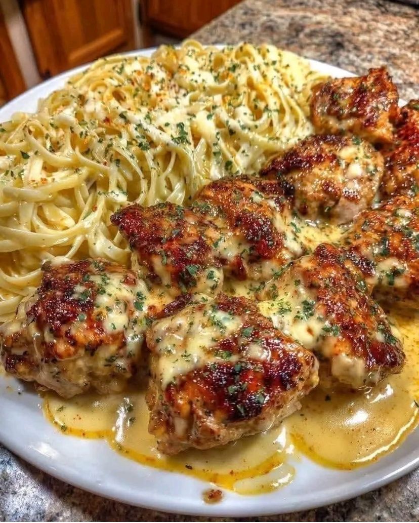 Creamy Garlic Butter Chicken & Linguine in Alfredo Sauce